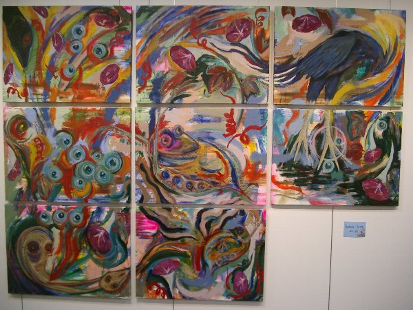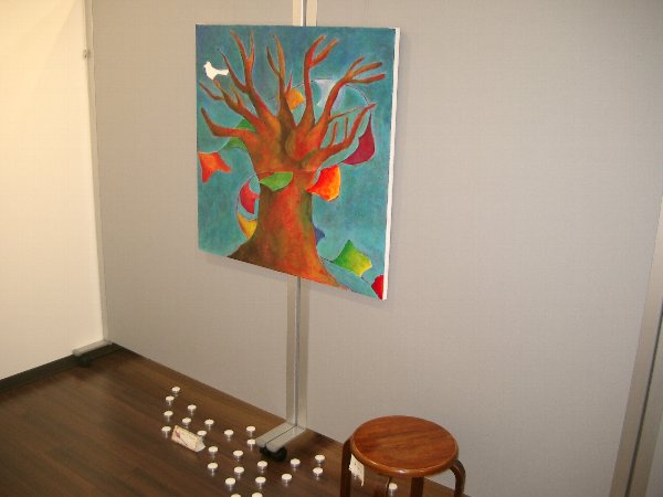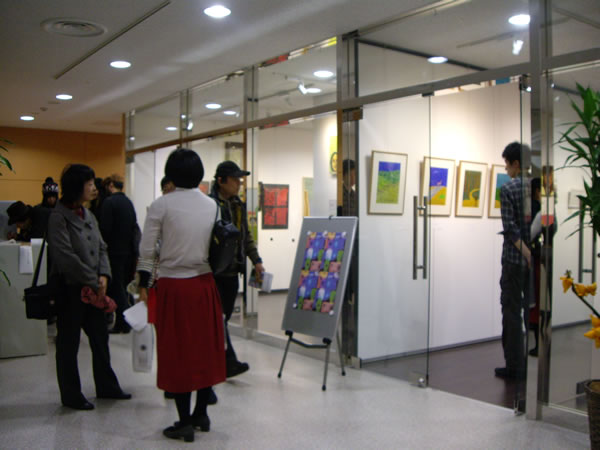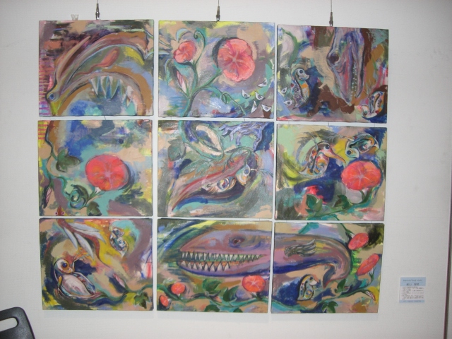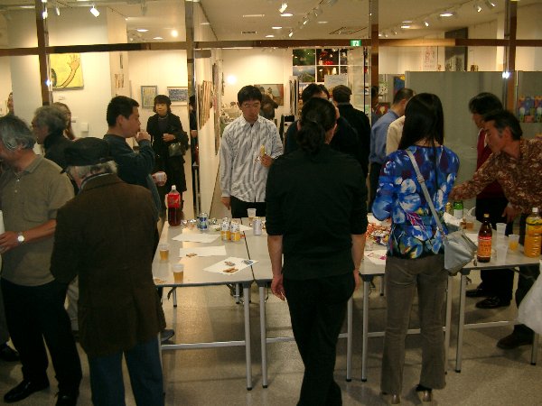 今回展の収穫は、出品者同士が知り合い、語り合い、親交を深めることが出来たことではないかと思います。第一回展ではなかなか交流の場面も取れず、個々バラバラの参加の感が残りましたが、今回は出品者同士が「あなたの作品は?」とお互いの作品を紹介し合い、意欲的に語り合う姿が目立ちました。一日目の交流会は広い会場で絵を前にしての交流が出来たこともあり、話がはずみ、5時から始まり、とりあえずの終了時間の7時以降もみんなの語り合いは閉館9時まで続きました。