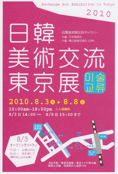 2010年8回目の日韓美術交流展が目黒美術館で8月3日から8日まで開催された。参加者は日本から日本美術会会員37名、会員外9名(アンデパンダン展出品者)の計46名、公州美術家18名をあわせて64名の作品が区民ギャラリー全面を使って展示された。