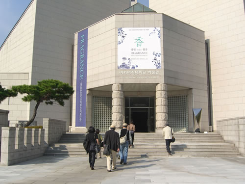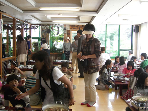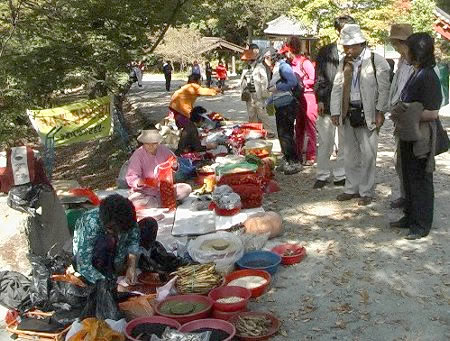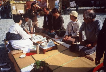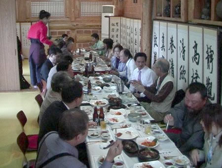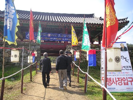 9日は「百済四王追慕祭」に参列。天女や雅楽や儒教式のそのセレモニーを興味深く見た。昼食後、公州の市場を歩き、公山城を散策。個々に街を散策した方も いた。城の前の広場で栗祭りのようなイベントやっていた。どうも百済文化祭が中止で、小規模にイベントがやられているらしい。ニューインフルエンザの影響 と説明があった。さて、公山城の城門で集合して、バスで鶏 龍山の甲寺(カプサ)に移動、老木が多いその寺を散策した。その奥にある伝統茶家で飲んだ、 黒く来いナツメの甘味のするお茶だった。その後下って門前街にある食堂で薬膳料理と云うのか、 ドングリの寒天のサラダ、人参もどきを焼肉のように焼いて食べ、マッコリを飲んだ。ここでソウルから合流した林さんが来て、今回参加の26名が全員そろっ た。タクシーで山道を登ってきた 時には心細かったらしい、林さんの言。夜は交流展の展示中で、呼び出されたり、宿にYATOOの友人が訪ねてきたりで忙しい夜になったが、毎回こんな感じ だ。