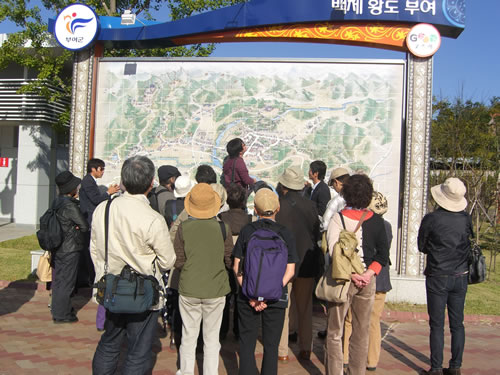 7 日に仁川空港で成田からの18名と、ソウルに先行1泊組み4人、関空からの3人の25名がそろい、公州から学生通訳の3人が迎えに来てくれて、4時過ぎ に出発、7時過ぎに公州に到着した。8日はまず、百済歴史博物館を見学し、映像やジオラマで百済の知識を入れ、扶余(プヨ)に向かったが有名な落花岩を川 から船で眺め、そこにのぼり、定林寺跡の仏塔を見て、その後昼食、宮南池を散策・スケッチなどして林立美術館での工芸展を見、その後「錦江アートセン ター」に到着、陶器に絵付けなど体験して、歓迎パーティーがそこのベランダで行なわれた。懐かしい顔と出会い、歓談したが、寒くなって来て、体調を崩した 人もいたようだった。