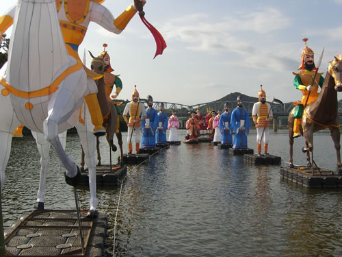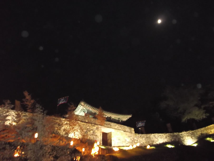 10月8日;扶餘博物館見学・午後は公州国際美術展のオープニングセレモニーに参加。日・韓美術交流展のオープニング。夜は、川のかかった浮橋を渡って公山城へ。川の中に設置された光のモニュメントが水に移り、美しかった。栗のマッコリを飲みながら城の前にある、栗祭りの市場の前で祭りの雰囲気を楽しんだ。