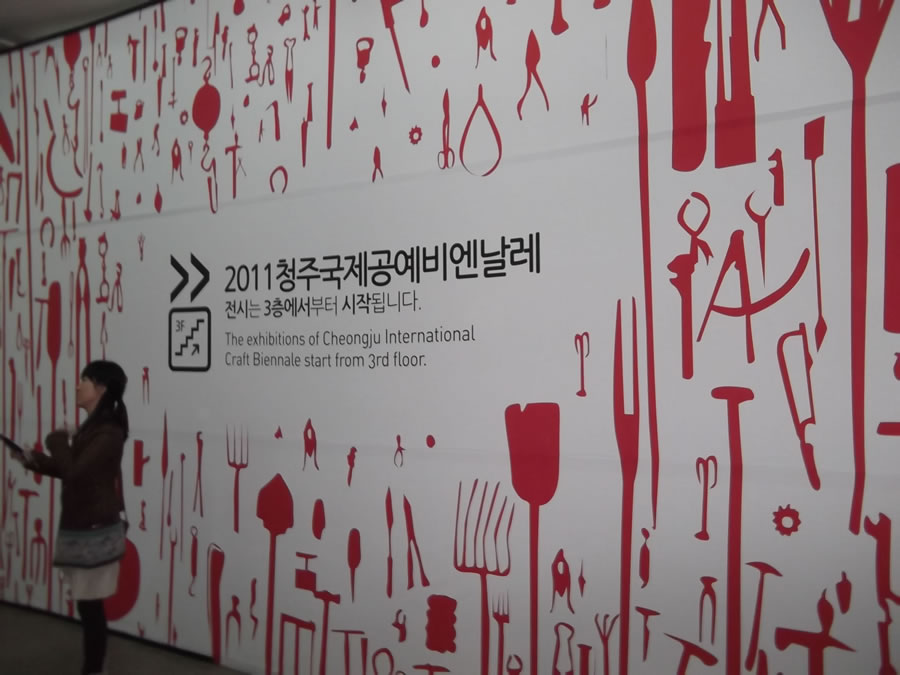 印象に残ったのは、8日の夜に見た光のモニュメントと、9日の清州国際工芸ビエンナーレだった。ビエンナーレ展は、たばこ工場跡の会場が面白く、天井の高さが8mくらいあり、工場跡のコンクリートの壁、広い会場に、世界中からの公募作品が並んでいた。日本人の作品もあり、ワークショップのブース・こども向け学習室などもあり、もっとゆっくり、時間をかけて観たかった。