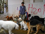 犬と言えば、朝、日中でも犬の散歩屋を見かけます。散歩屋は腰に犬を繋ぐ金具をいっぱいぶら下げて歩きます。繋が れている犬もいれば、繋がれてなくてもきちんと歩いてグループについて行く犬もいます。10匹ぐらい一緒に脇目もふらず、横断歩道では信号待ちをし、散歩 しています。公園や駅の前には犬を遊ばせる広い場所が金網で囲ってあり、そこで犬を放して遊ばせる為に連れていくのです。たったっと足並みそろえて歩く犬 を見て、犬の躾のプロだなと感心してしまいます。こちらの犬はおっとりしていてあまり吠えません。散歩屋が他の犬を迎えに行っている間は大人しく歩道で 待っています。勝手に歩き回ったりしません。