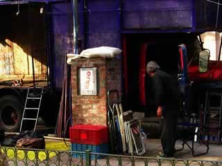 上の写真のトラックは色が青紫に塗ってあり、そばに立っている年配の男の人は番をしているらしく、椅子を出して昼寝をして いることが多いです。古さといい、色といい、周りにごちゃごちゃと物が置いてあり想像力を掻き立てられるトラックです。
