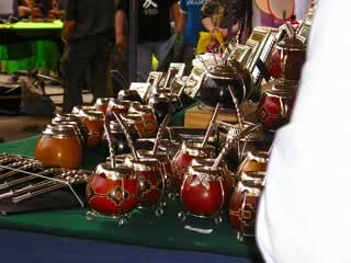 マテ容器を売っているお店も数軒出ています。マテ茶は日本人が日本茶を飲んで落ち着くようにアルゼンチンでは欠 かせない飲み物です。マテと呼ばれる容器にマテの乾燥した葉を入れてお湯を注ぎ、ボンビージャで(金属製のストローと思えばよい)飲みます。ボンビージャ は先に数個の穴が開いていますから、茶漉しをされ、マテ茶だけを飲むことが出来るのです。最初抵抗があったのは、前に飲んだ人がお湯を注ぎ、廻してきま す。一つのボンビージャで廻し飲みをすることでした。これが友人である証のようなことでもあるらしく、飲むと喜んでくれます。最近は慣れて、暑いから、寒 いから、疲れたから、イライラするからと言っては飲んでいます。アルゼンチンの人は甘いものが大好きですから、砂糖、蜂蜜、ドゥルセ デ レーチェなどを 入れて飲む人もいます。マテ茶の入れ方もあって、マテの葉を入れたら、容器を手のひらの上で逆さにし、手のひらにつく小さな粉を取り除き、ボンビージャを 入れてボンビージャに沿ってお湯を注ぎ、最初の一吸いはペッと吐くと苦くないと教えてくれました。勿論お湯も沸騰したお湯はだめで、少し冷ましてから専用 のポットに入れて使います。ボンビージャで容器の中の葉をかき混ぜては駄目とも言われました。容器も、ボンビージャもいろいろな形があってそれを見て回る のも楽しいものです。マテ・コシードといって、ティーパックになっているのもありますが、味が全然違います。これを飲むから野菜を食べなくても大丈夫と言 う人もいます。