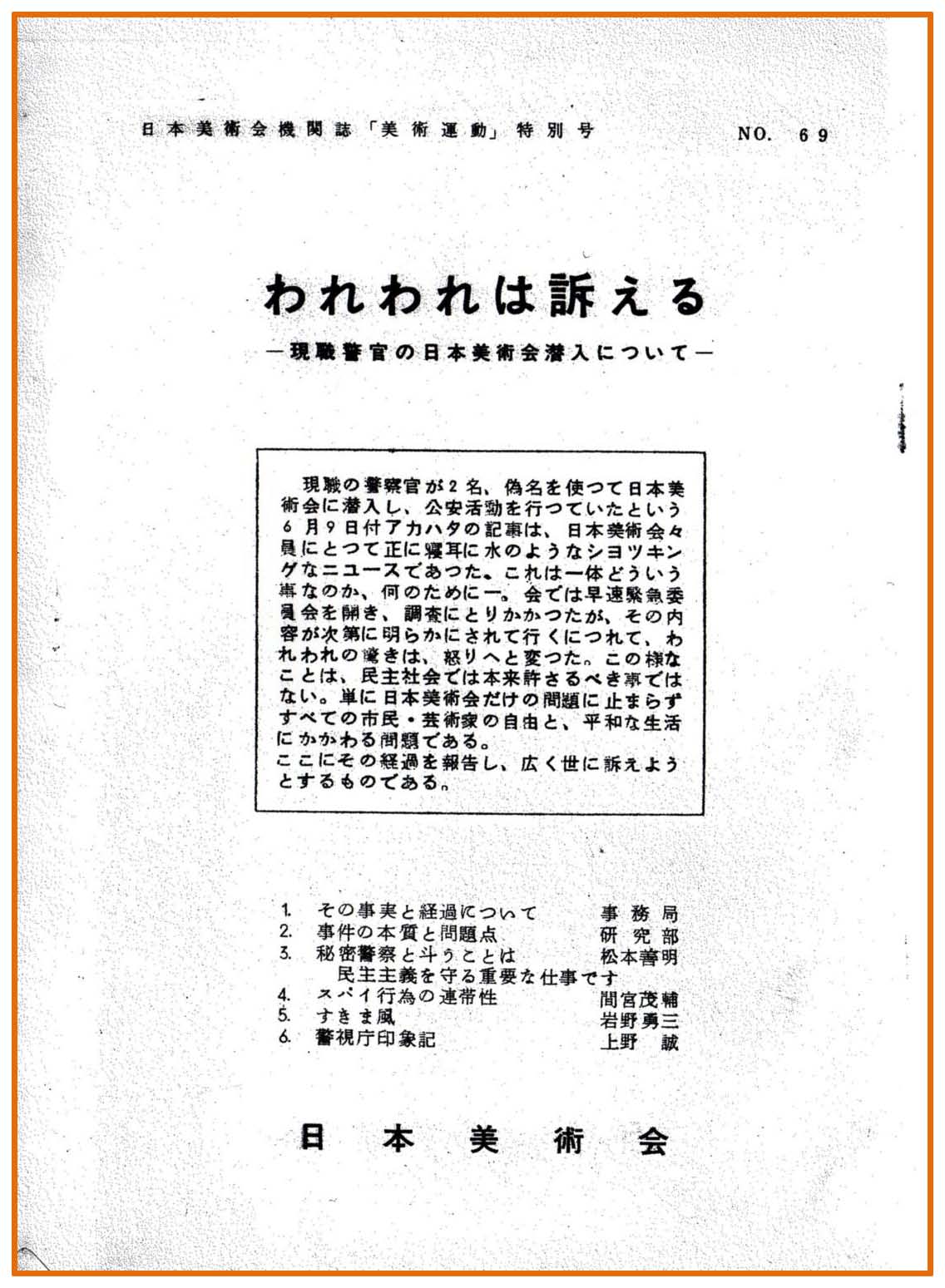 現役警官の日本美術会潜入について「美術運動」特別号69号を発行